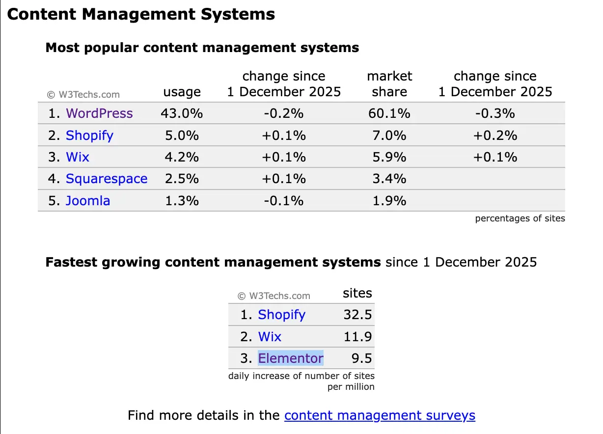 WordPress目前市场占有在43%以上,并保持持续增长的趋势。