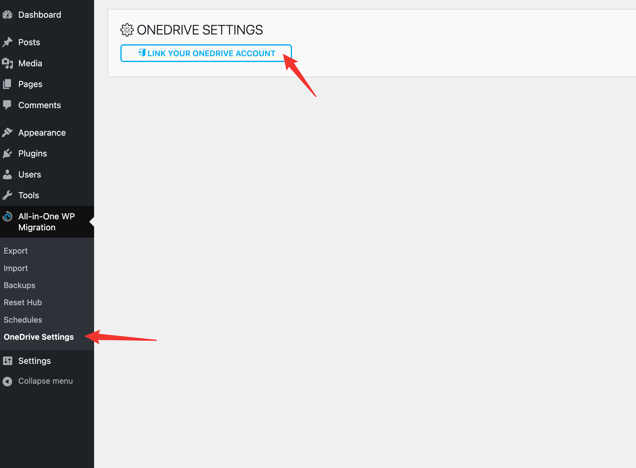 进入到网站后台All-in-One WP Migration的OneDrive Setting菜单,点击【Link Your OneDrive Account】连接你的OneDrive账号。