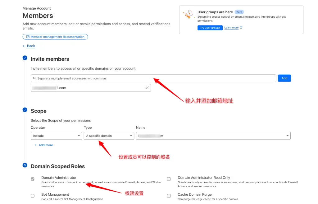 设置成员的邮箱,范围,以及权限,参照下图,我邀请一个成员,并将一个特定域名的管理员操作权限赋予给这个邀请的账号。