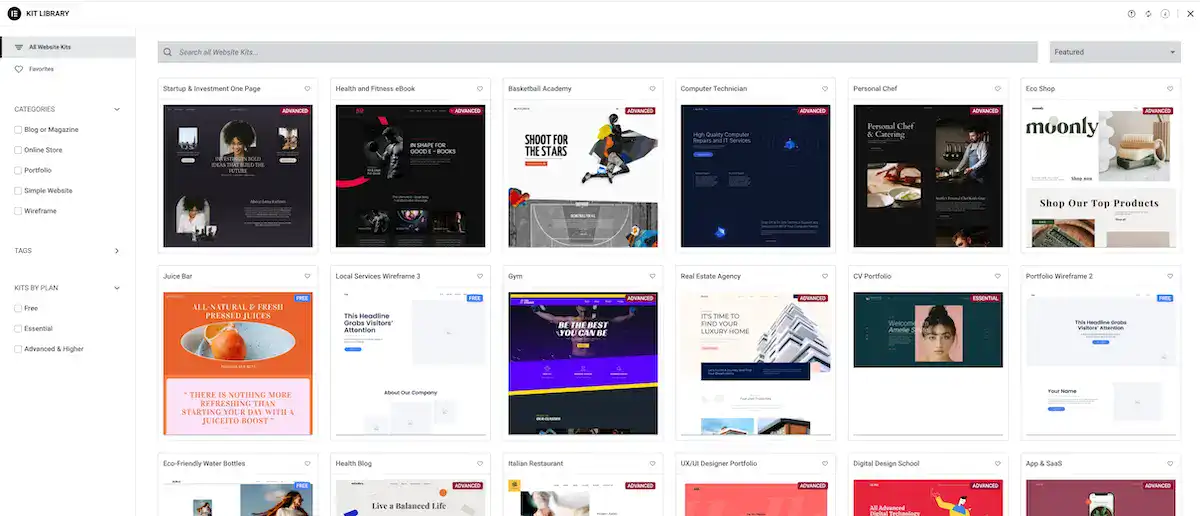 进入之后你可以看到所有模版套件,注意这里是整站的模版套件,并且你需要根据你的Elementor订阅版本选择套件,如果你是免费的Elementor,只能选择免费的套件导入(免费套件导入之后是没有Header和Footer的,但是你可以通过Hello Biz主题提供的免费Header和Footer构建器来构建网站的页眉和页脚)。
