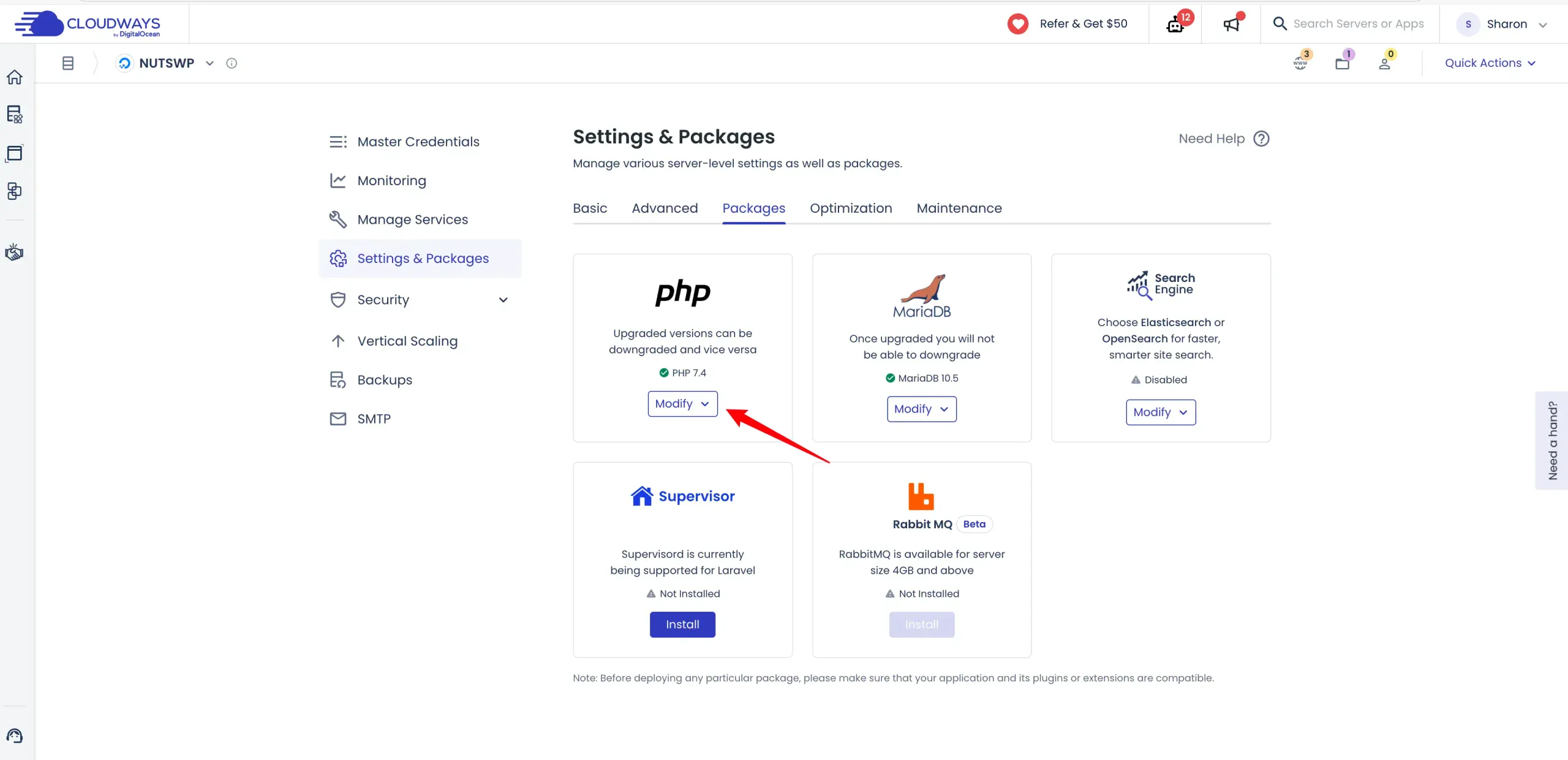 登录到你Cloudways账号,进入对应的主机管理,在Settings & Packages菜单中的Pakage标签卡下可以修改PHP版本。