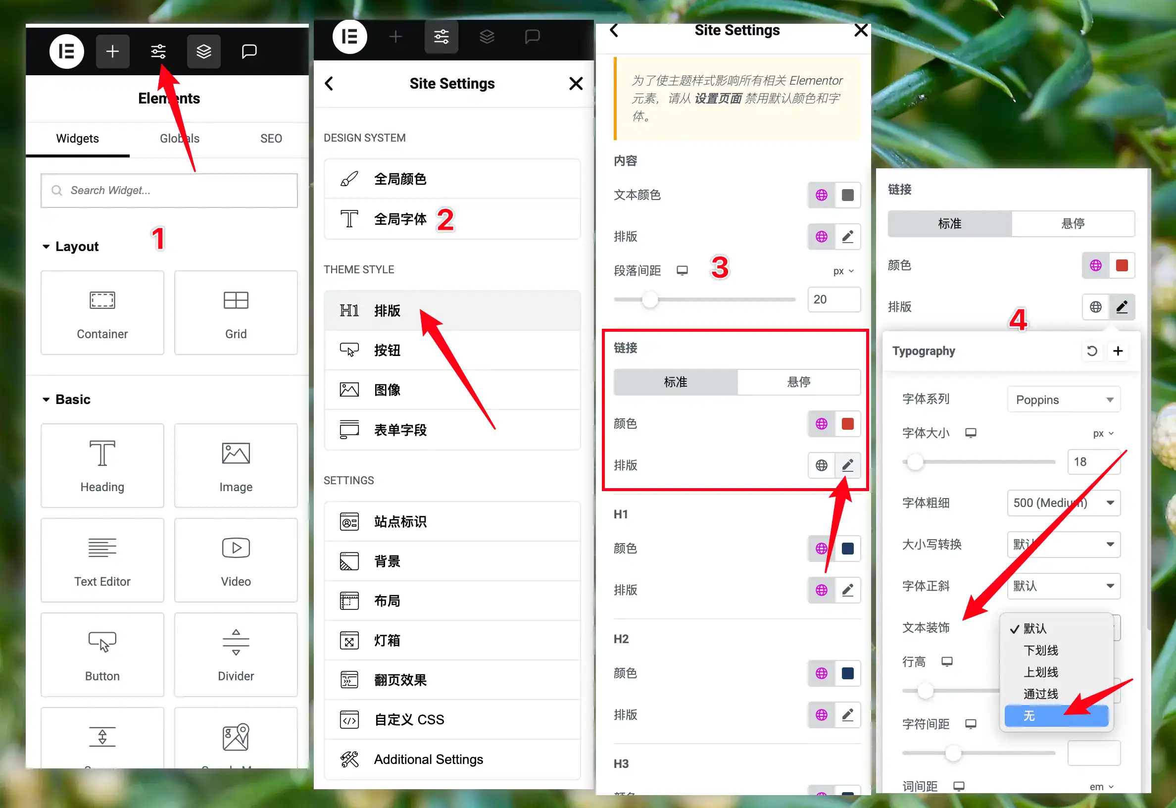 一部分主题和编辑器包括Elementor会默认给链接添加下划线,这种情况你会发现通过对元素的样式调整无法取消,那么你就需要进入到主题设置或者编辑器的全局样式设置中去找到排版中的A标签样式设置,将下划线设置为无。