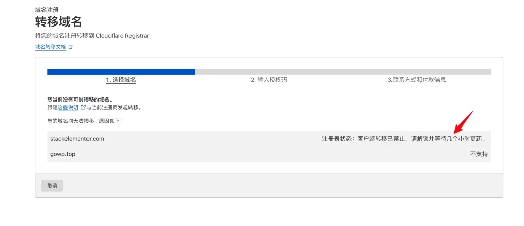 解锁之后不会立即生效,需要等待几小时。几小时之后返回到Cloudflare的Transfer Domains页面查看。