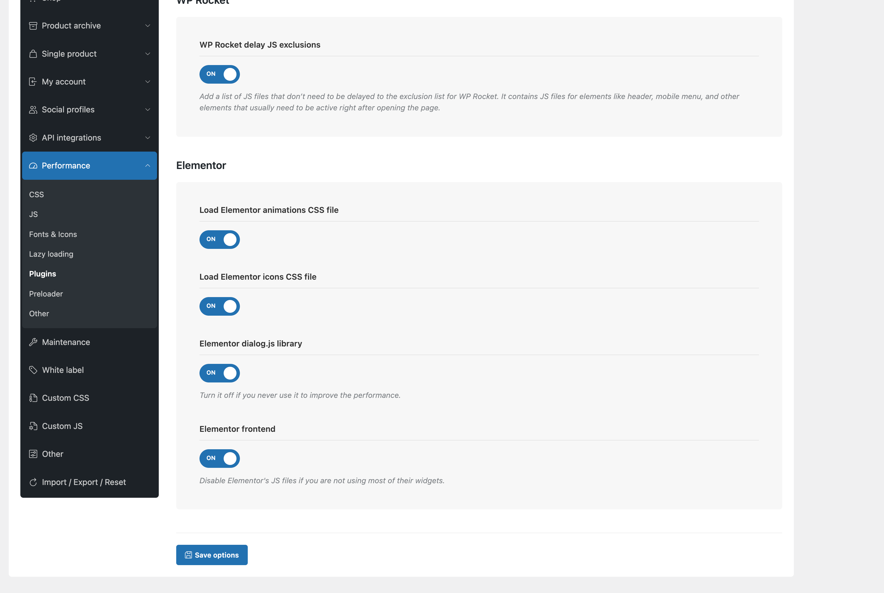 接下来开始排查Woodmart主题的选项,这种问题大概率和性能选项有关系,所以我优先去检查Woodmart主题的性能选项。
